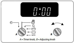 To set the time, turn and hold the Timer knob to the clock symbol and at the same time turn the Adjusting knob left or right until the clock shows the time of day. Remember this is a 24-hour clock. Let go of the Timer knob and it will spring back to the vertical, oven manual setting.